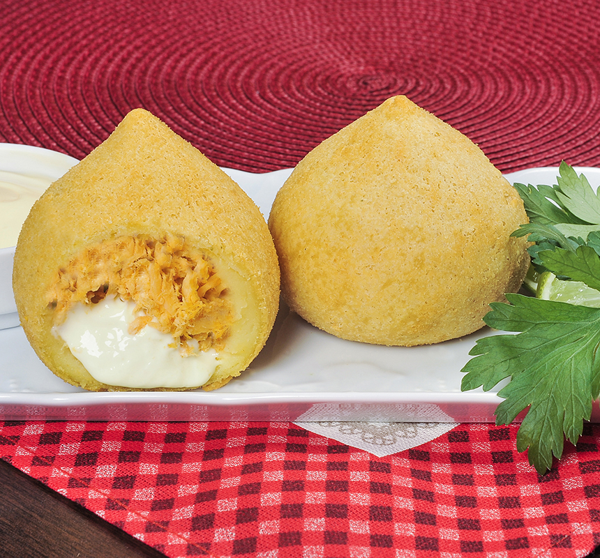 - Coxinha de frango desfiado, com requeijão cremoso, margarina, cebola, extrato de tomate, óleo de soja, farinha de rosca, sal, ketchup, mostarda amarela, alho e molho de pimenta.