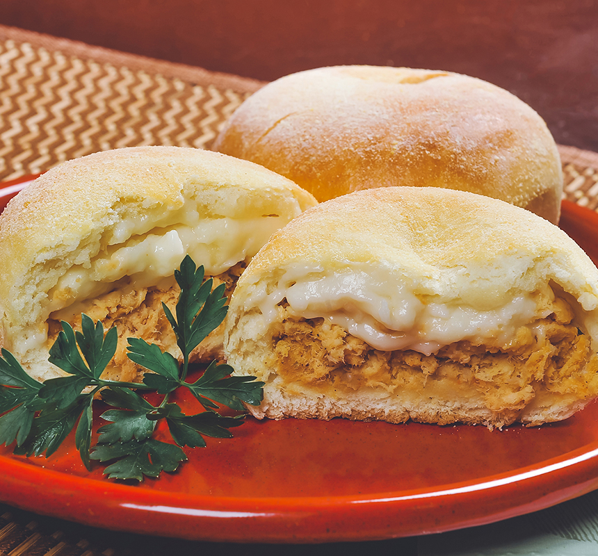 - Farinha de trigo enriquecida com ferro e ácido fólico e ferro, margarina, fermento biológico, água, conservante propionato de cálcio e sal, recheio de frango desfiado com requeijão.